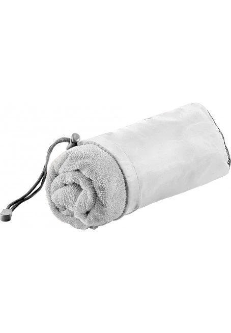 80% polyester / 20% polyamide. Light weight towel for ultra-fast drying. Overlocked seams. Contrast zipped pocket at lower corner. Polyamide color coordinated carry pouch with elasticated drawstring and meshed bottom for ventilation (color Soft Blue: pocket in contrasting Navy). Pocket size: 25 cm. Size: 100 x 50 cm