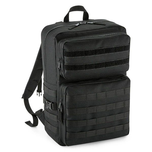 Material: 600D Polyester; Dimensions: 30 x 45 x 22 cm; Capacity: 25 litres; TearAway label for ease of rebranding, military inspired design, dual Rip-Strip™ MOLLE webbing, MOLLE webbing loop detail, two large zippered front pockets, zippered main compartment, internal slip pocket, grab handle, padded back panel, compression straps, padded adjustable shoulder straps, compatible with MOLLE Utility Patch, compatible with Modulr™ Multipockets BG241 and BG242