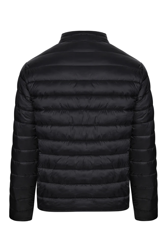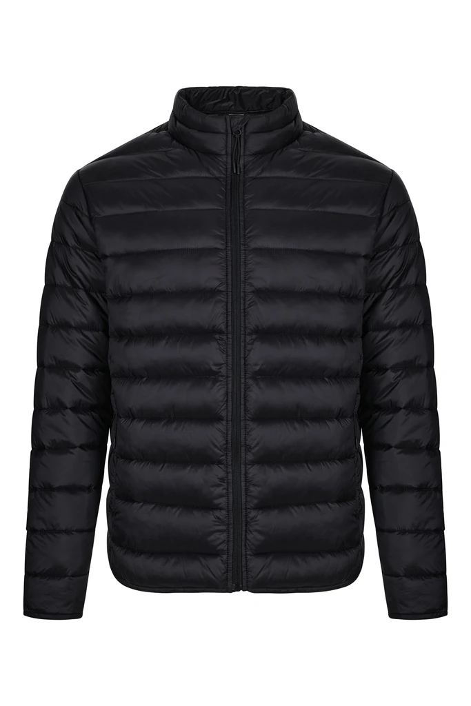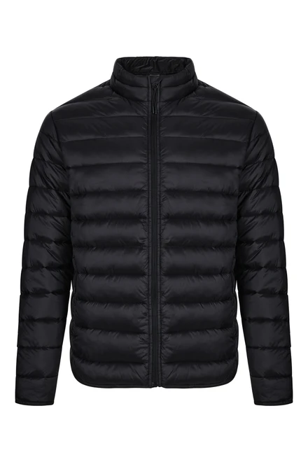 UNISEX padded jacket. 100% Polyamide. 380T. 310 g/m². Water repellent. Feathers like fake feathers. Full front reverse zip with chin guard. 2x side pocket with reverse zip. Tone-on-tone zip with plastic tip and polyester puller. Slanted trim on bottom and cuffs. Hanging loop on the inside of the collar.