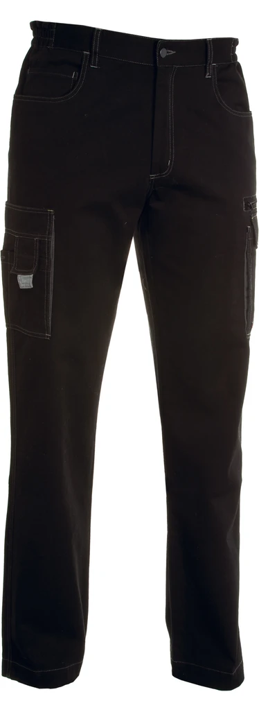 Multi-season unisex trousers with side elastic and waist belt loops. Zip fastening with metal button, three jeans-style front pockets, one LOCK SYSTEM side pocket and one zip pocket, one multi-function pocket, two back pockets, one open and one with flap and Velcro. Contrasting inserts, reflective stripes on the back pocket