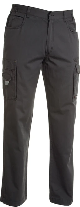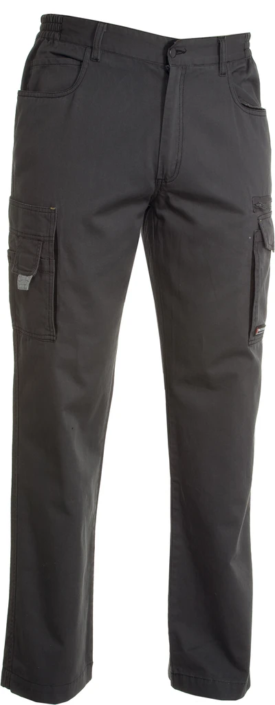 Multi-season unisex trousers with side elastic and waist belt loops. Zip fastening with metal button, three jeans-style front pockets, one LOCK SYSTEM side pocket and one zip pocket, one multi-function pocket, two back pockets, one open and one with flap and Velcro. Contrasting inserts, reflective stripes on the back pocket