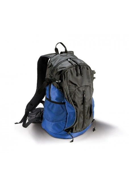 City/Sports backpack in ripstop + honeycomb polyester, PU backing, front zipped pocket , 2 main compartments, side mesh pockets, elastic trekking pole holders, adjustable ergonomic straps and belt, hole for water bag tube. SBS zips.