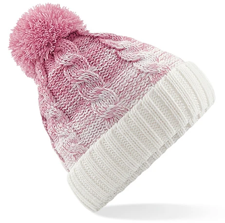 TearAway label for ease of rebranding, cuffed design for optimal decoration, heavyweight multi yarn cable knit design, self-coloured pom pom