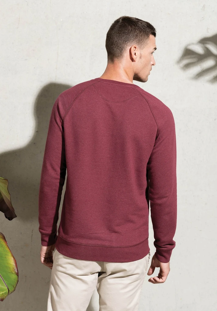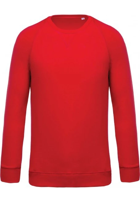 80 % organic cotton / 20 % polyester certified OCS Blended - Organic Content Standard. French terry. Trendy style. Ribbed neck, cuffs and hem. Twill taped neck and V finish at neckline. No brand label at neck, only size tag for easy decoration access.