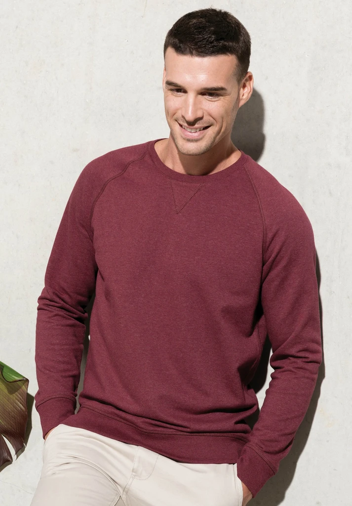 80 % organic cotton / 20 % polyester certified OCS Blended - Organic Content Standard. French terry. Trendy style. Ribbed neck, cuffs and hem. Twill taped neck and V finish at neckline. No brand label at neck, only size tag for easy decoration access.