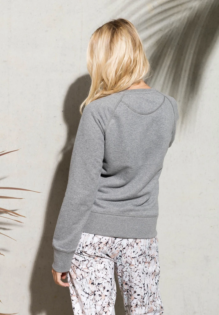 80 % organic cotton / 20 % polyester certified OCS Blended - Organic Content Standard. French terry. Trendy style. Ribbed neck, cuffs and hem. Twill taped neck and V finish at neckline. No brand label at neck, only size tag for easy decoration access.