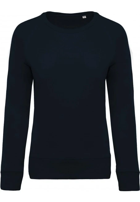 80 % organic cotton / 20 % polyester certified OCS Blended - Organic Content Standard. French terry. Trendy style. Ribbed neck, cuffs and hem. Twill taped neck and V finish at neckline. No brand label at neck, only size tag for easy decoration access.