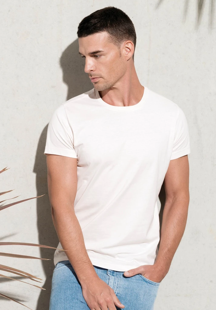 100 % organic cotton certified OCS 100 - Organic Content Standard (Wine Heather, Ocean Blue Heather and French Navy Heather : 80 % organic cotton / 20 % polyester certified OCS Blended. Grey Heather : 70 % organic cotton / 30 % viscose certified OCS Blended). Fashion slim fit. Ribbed crew neck. No brand label at neck, only size tag for easy decoration access.