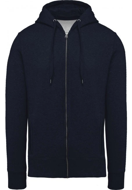 80 % organic cotton / 20 % polyester certified OCS Blended - Organic Content Standard. Brushed fleece. Trendy style. 2 front pockets with piping. Metal zipper,. Ribbed cuffs, hem and lined hood edge with matching drawstring. Inner twill taped neck. Earphone access on front pocket and neck. No brand label at neck, only size tag for easy decoration access.