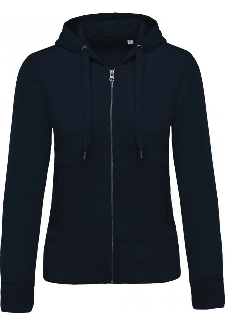 80 % organic cotton / 20 % polyester certified OCS Blended - Organic Content Standard. Brushed fleece. Fashion slim fit. 2 front pockets with piping. Metal zipper. Ribbed cuffs, hem and lined hood edge with matching drawstring. Twill taped neck. Earphone access on front pocket and neck. No brand label at neck, only size tag for easy decoration access.