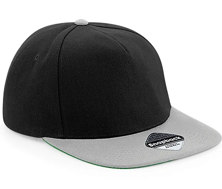 5 panel design, flat peak, authentic peak sticker, green underpeak, stitched ventilation eyelets, retro style Snapback size adjuster