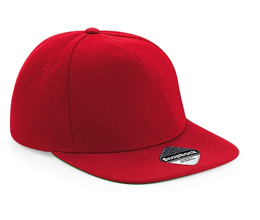 5 panel design, flat peak, authentic peak sticker, green underpeak, stitched ventilation eyelets, retro style Snapback size adjuster