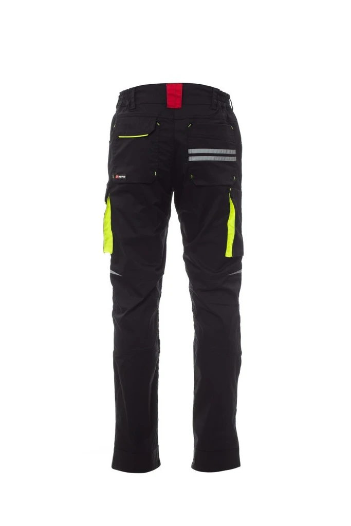 Unisex pants, stretch, all-season, elastic bands on the sides and belt loops at the waist, zipper closure and a customized button. The trousers have two shaped pockets on the front, a coin pocket on the right side and a zippered safety pocket on the left side. On the front of the left leg there is a gusset pocket, a Velcro flap and a name tag pouch. On the front of the right leg there is a phone pocket with a reflective hem and a pocket with a gusset. Both legs have attachments for Nylon O knee pads.