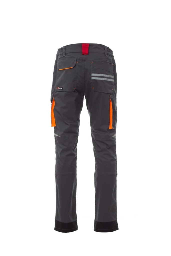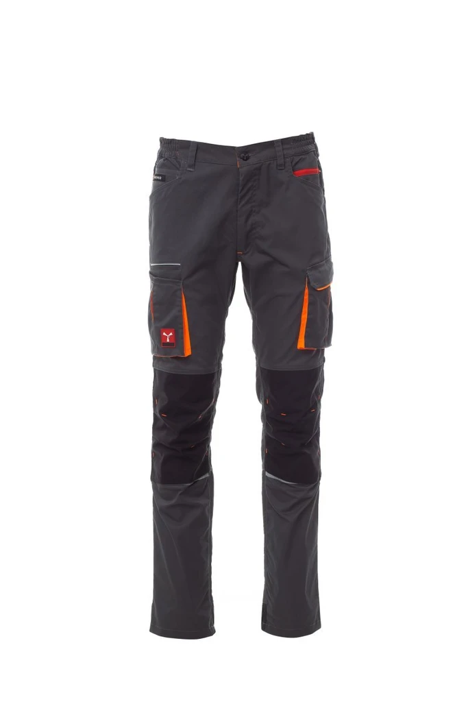 Unisex pants, stretch, all-season, elastic bands on the sides and belt loops at the waist, zipper closure and a customized button. The trousers have two shaped pockets on the front, a coin pocket on the right side and a zippered safety pocket on the left side. On the front of the left leg there is a gusset pocket, a Velcro flap and a name tag pouch. On the front of the right leg there is a phone pocket with a reflective hem and a pocket with a gusset. Both legs have attachments for Nylon O knee pads.