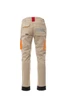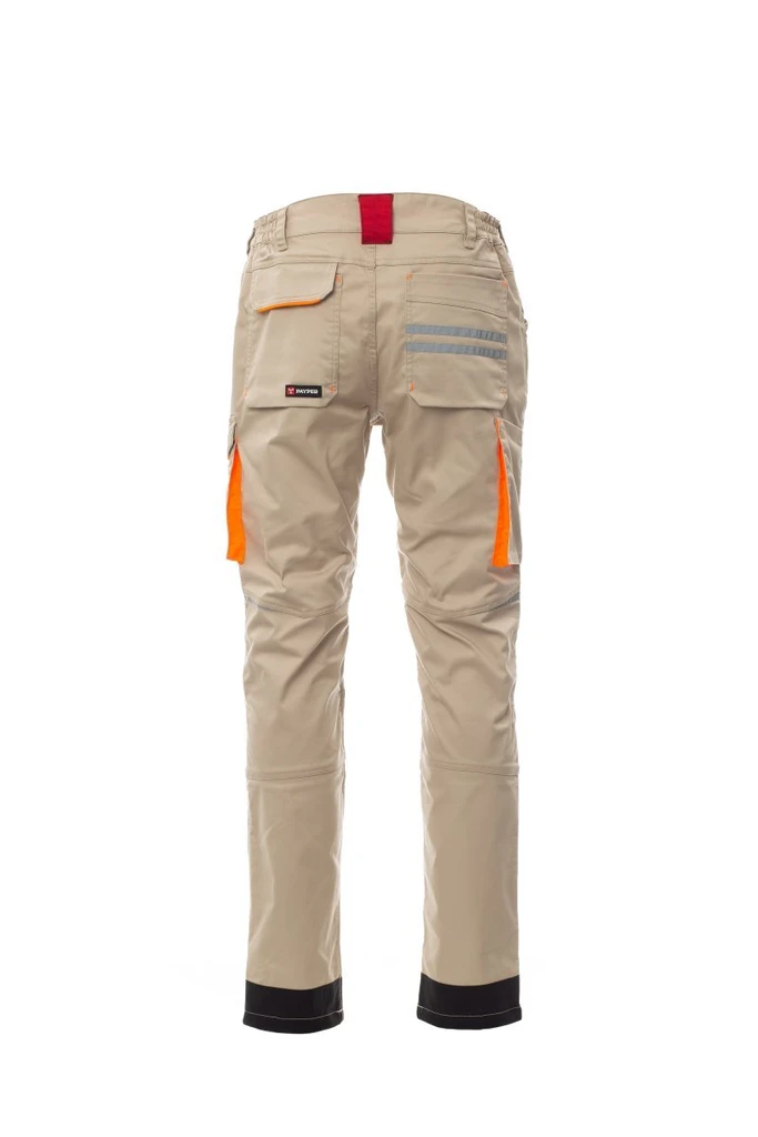 Unisex pants, stretch, all-season, elastic bands on the sides and belt loops at the waist, zipper closure and a customized button. The trousers have two shaped pockets on the front, a coin pocket on the right side and a zippered safety pocket on the left side. On the front of the left leg there is a gusset pocket, a Velcro flap and a name tag pouch. On the front of the right leg there is a phone pocket with a reflective hem and a pocket with a gusset. Both legs have attachments for Nylon O knee pads.