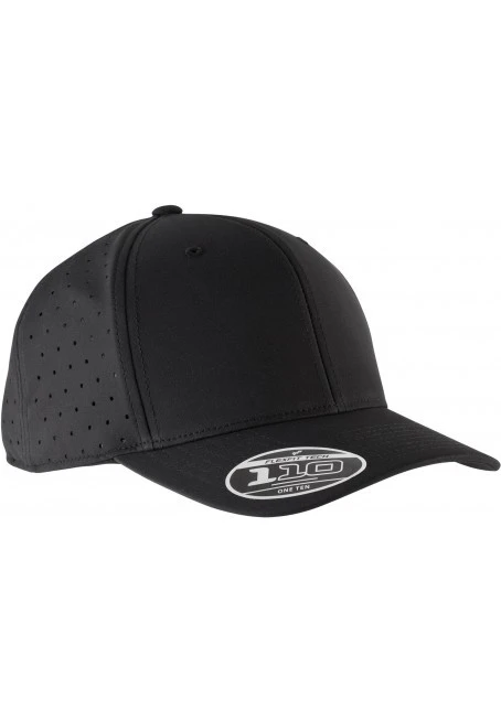 92 % polyester / 8 % elastane. 6 panels. Curved peak and reinforced panels inside crown to maintain shape. Flexfit® Cool & Dry technology for added comfort and optimal absorption of moisture on inner elasticated band. Laser perforations on side and back panels. Size adjuster with tear release fastening.