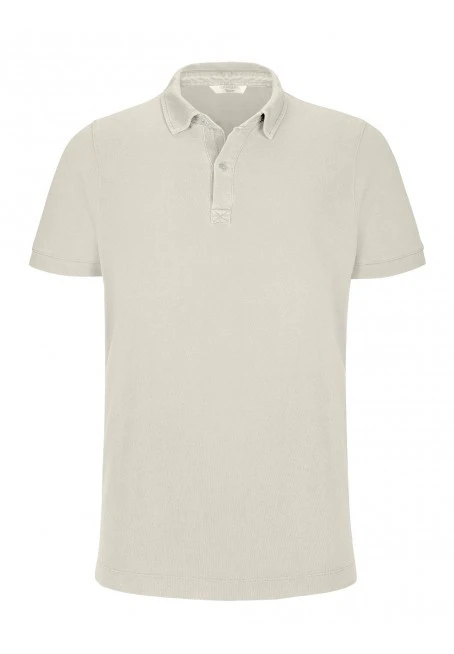 100% preshrunk cotton piqué. Garment washed and dyed for vintage look. Chevron button tab with two clear buttons. Open sleeve.