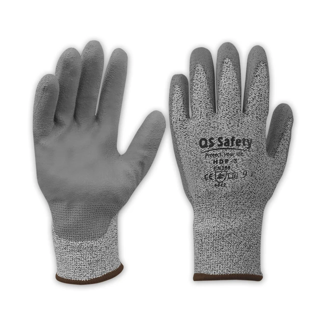 Heavy-duty 13G polyethylene gloves, ventilated back, knit cuff, polyurethane coated; Features: sturdy - Strengths: comfort, grip, sensitive, precision, resistant to cuts; Areas of application: handling and assembly of cutting, dry or slightly oily items