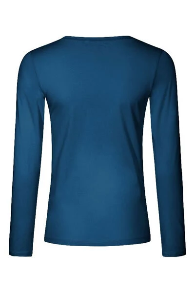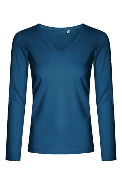 Long-sleeve, V-neck single-jersey t-shirt with collar is made of combed cotton. The especially smooth surface and flowing fabric give the jersey a unique, elastic and silky finish. The T-shirt has a narrow cut and is made with side seams. Certified according to OEKO-TEX®