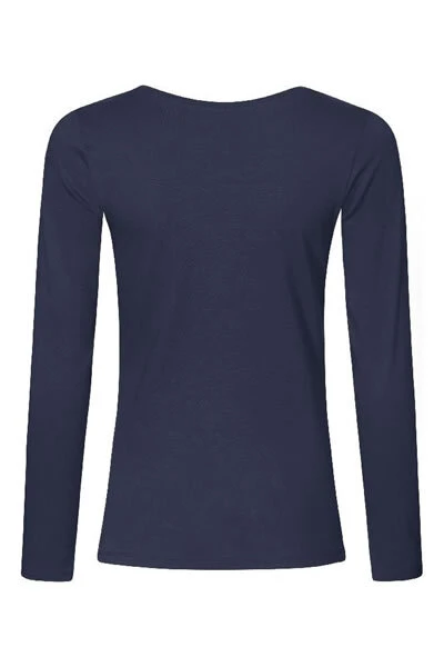 The unique single jersey long-sleeve t-shirt with a custom fabric collar is made from long-staple combed cotton. The particularly smooth surface and soft-fitting fabric give the jersey a unique, elastic and silky finish. The T-shirt has a narrow cut and is made with side seams. Certified according to OEKO-TEX®