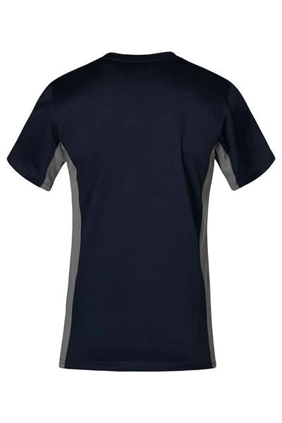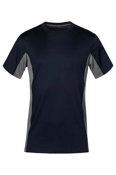 The functional single-jersey T-shirt is made of a mixed fabric with a side part in a contrasting color. The T-shirt is gentle on the skin and dries quickly, it is made of combed cotton on the inside and polyester on the outside. The T-shirt has a unisex cut and side seams.