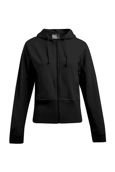Modern molton sweatshirt with hood, unbrushed, has full-length plastic zipper in tone, also elastane cuffs on the sleeves and hem. The sweatshirt has a wide saddle waist, ribbed gusset loops and front pockets with contrasting ribbing. The sweatshirt is made of combed cotton with elastane content for greater freedom of movement and has a figure-hugging cut.