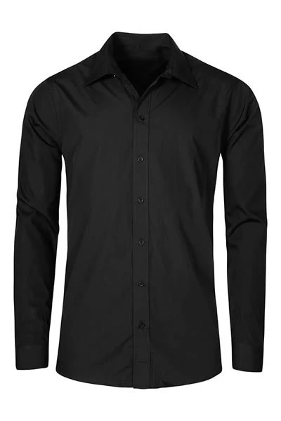 A classic long-sleeve poplin blend shirt with a reinforced kent collar and button panel with tonal buttons, as well as a separate chest pocket and spare buttons. Specific features of this shirt: 2-button adjustable cuff (barrel cuff), long sleeve placket with button, double back saddle, turned hem, made of combed cotton with polyester. The shirt is modern shear.