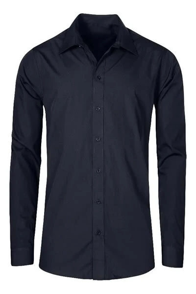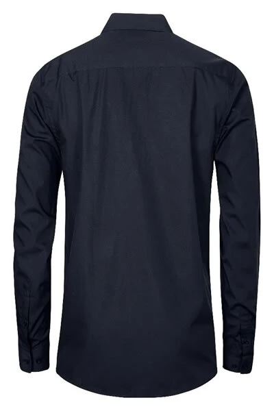 A classic long-sleeve poplin blend shirt with a reinforced kent collar and button panel with tonal buttons, as well as a separate chest pocket and spare buttons. Specific features of this shirt: 2-button adjustable cuff (barrel cuff), long sleeve placket with button, double back saddle, turned hem, made of combed cotton with polyester. The shirt is modern shear.