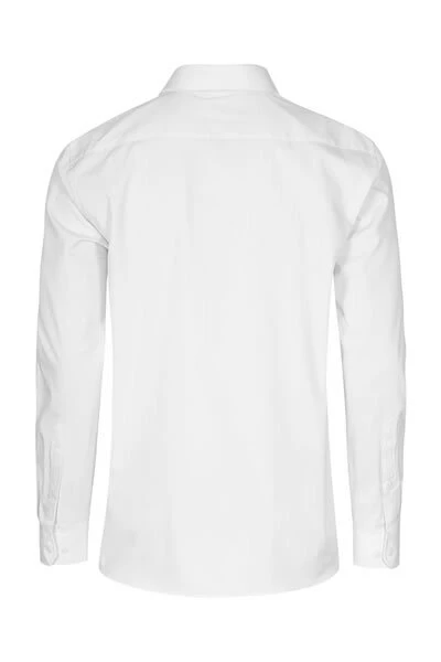 A classic long-sleeve blend oxford shirt with a reinforced kent collar and tone-on-tone button placket has a separate breast pocket with a spare button. Specific features of this shirt: low-maintenance blend fabric, front and back darts, double back saddle, curved hem, made of combed cotton with polyester. The shirt has a modern cut.