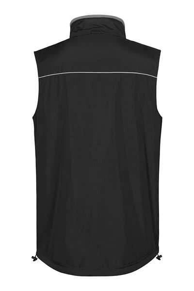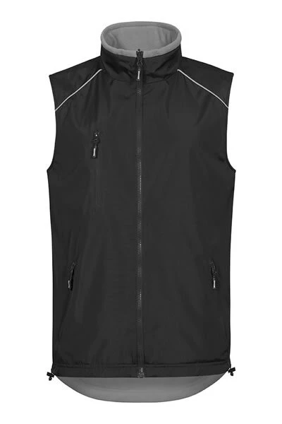 The double-sided vest with a Napoleon pocket on the front has two side pockets with a zip. The vest has a sewn-in key ring in the side pocket, reflective piping and zip pullers. The vest is equipped with a tunnel drawstring at the hem with a stem, a curved hem and an invisible zip for decoration. It has a modern cut.