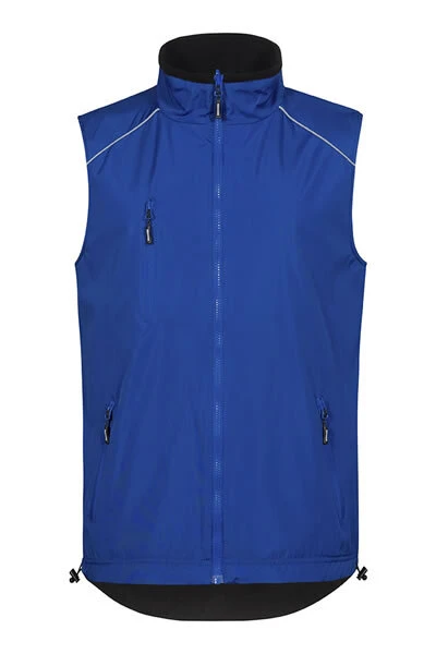 The double-sided vest with a Napoleon pocket on the front has two side pockets with a zip. The vest has a sewn-in key ring in the side pocket, reflective piping and zip pullers. The vest is equipped with a tunnel drawstring at the hem with a stem, a curved hem and an invisible zip for decoration. It has a modern cut.