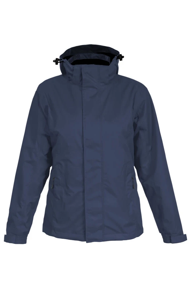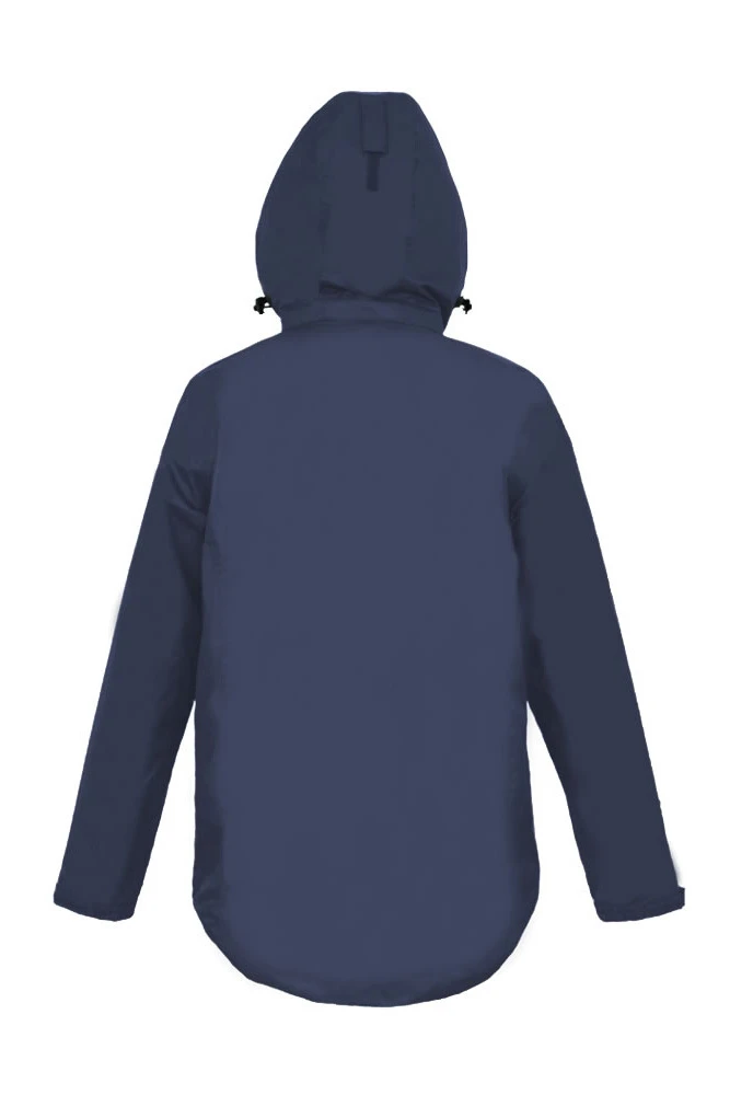 Performance jacket with hidden two-way zip plus Velcro fasteners, removable hood with volume control at front and back. The jacket has a hidden Napoleon pocket with a zip, adjustable sleeve cuffs with velcro closure, tunnel drawstring at hem with internal shanks, two side zip pockets, invisible embellishment zip, zip and closure on replaceable inner jacket. It is waterproof, windproof and breathable. The jacket has a modern cut.
