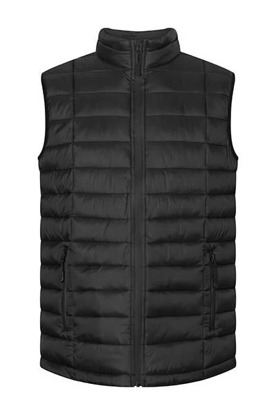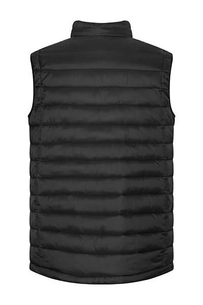 The padded vest has waterproof zips, a stand-up collar, a chin guard, an internal pocket, a full-length zip, two side zip pockets, a drawstring hem with a zip inside, an invisible zip to finish. The vest is made of nylon (outer/inner material) and polyester (padding). The vest has a modern cut.
