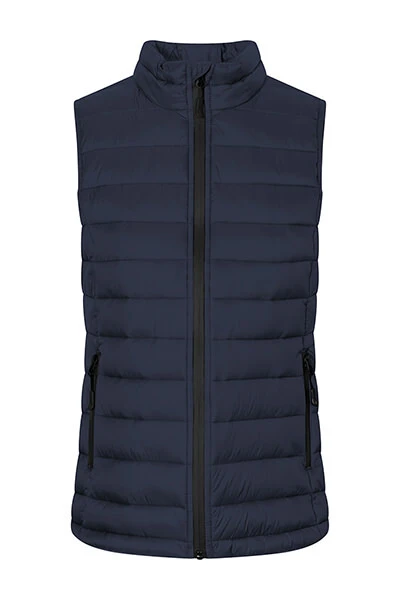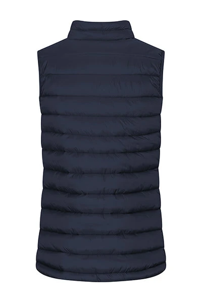 Padded vest. Features: waterproof zips, stand-up collar, chin guard, inside pocket, full-length zip, two side zip pockets, tunnel drawstring at hem with inner shank, invisible zip for embellishment, neutral size label. The vest is made of nylon (outer/inner material) and polyester (wadding). The vest has a modern cut.
