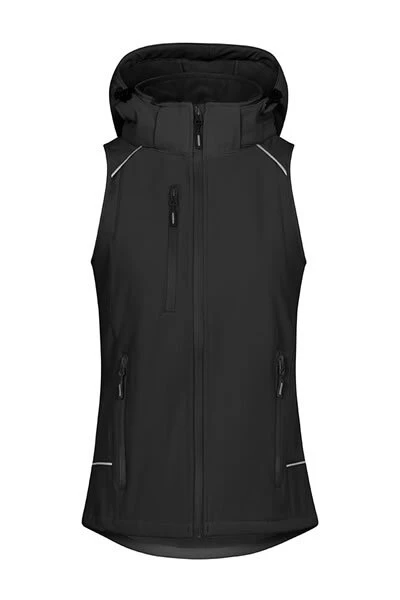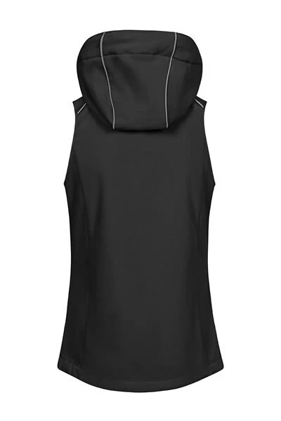 Functional waistcoat with detachable hood and volume regulator features waterproof zips, chin guard, napoleon pocket, tunnel drawstring at hem with internal drawstring stops, two zipped side pockets and sewn-in key ring in side pocket. The vest has reflective trim and zipper pullers. The material of the vest is breathable and waterproof (8,000 mm). The vest has a modern cut.