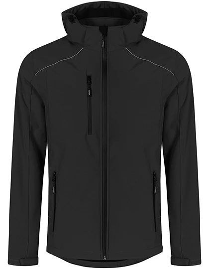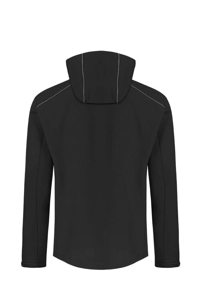 Functional softshell jacket with removable hood and volume regulator has waterproof zips, chin guard, Napoleon pocket, also sleeve pocket and adjustable sleeve cuffs with Velcro. The drawstring at the hem is enriched with stems inside. The jacket has two zipped side pockets, a sewn-in key ring in the side pocket, reflective piping and zip pullers. Yippee waterproof, windproof and breathable. It is made of white-elastic bonded polyester fleece with elastane for greater comfort. The jacket stands out with its modern cut.