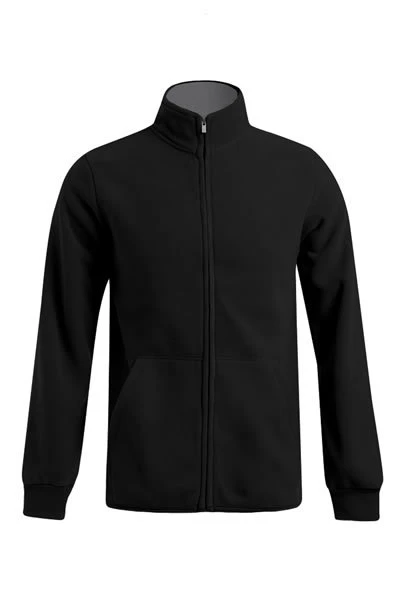 The double fleece jacket has a stand-up collar and a full-length concealed zip, as well as narrow cuffs with elastic trim and two zipped side pockets. The inside of the jacket is in a contrasting color and is made of polyester with anti-pilling treatment on both sides. The fleece jacket has a narrow cut.
