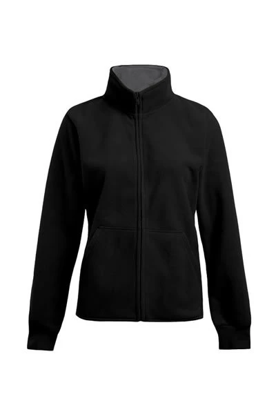 The double fleece jacket with a stand-up collar and a full-length zip is matched with elastane sleeve cuffs and tactile pockets with decorative stitching. The inside of the jacket is in a contrasting color and it is made of polyester with anti-pilling treatment on both sides. The fleece jacket has a modern cut.