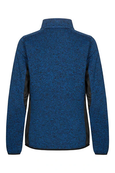 The contrast knit fleece stand-up jacket is combed inside, has side and sleeve panels, and a narrow bottom hem on the body and sleeves with elastic binding, also in contrasting colors. The jacket is made of polyester and has a narrower cut.