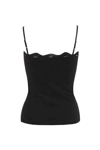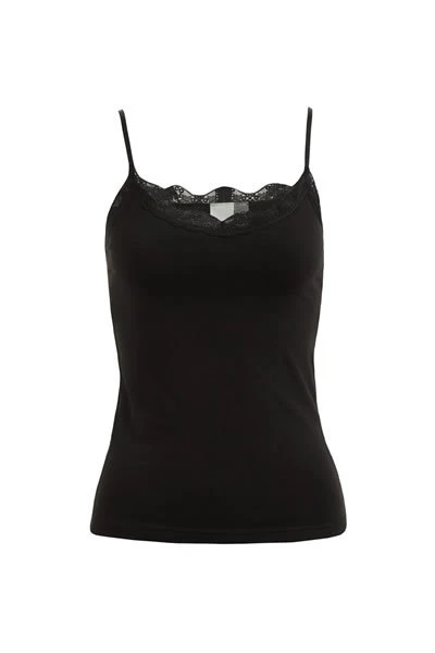 Fashionable single jersey top with lace trim and adjustable spaghetti straps is made from a cotton blend with elastane for added comfort. The top has a modern cut and is made with side seams.
