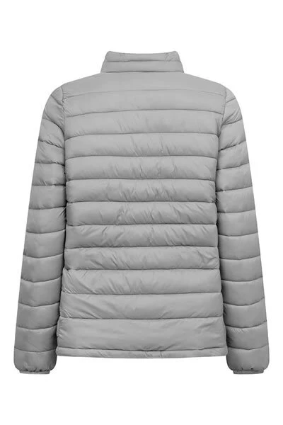 Padded jacket with waterproof zips, stand-up collar, chin guard, inside pocket. The jacket has a full length zip, two side zip pockets, a tunnel drawstring at the hem with internal shanks and an invisible zip for decoration.