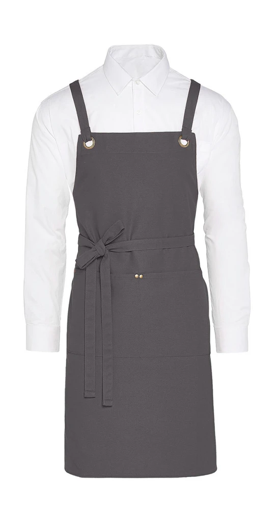 With its 2 antique brass eyelets and rivets, this Canvas bib apron with cross-over ties at the back is for the masters! Available in fashionable colours, wth a practical front pocket and ideal length for great freedom of movement, it's perfect for professional teams and people "Fashion" oriented. Washable at 60°, it's also colourfast and easy care, for a long-lasting fresh look.