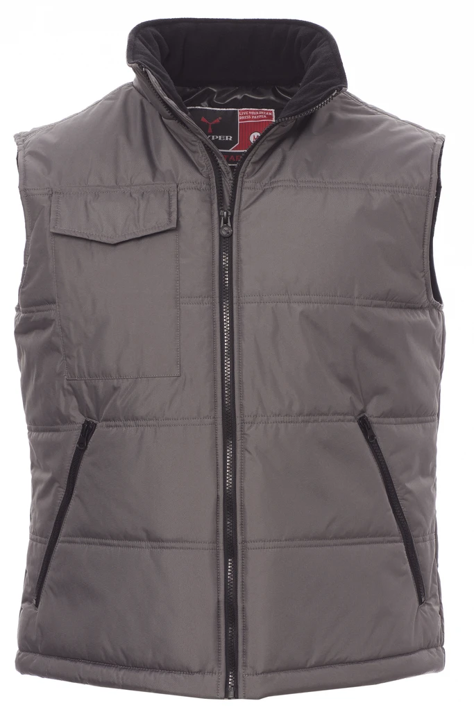 Quilted vest with contoured back and padding, finished with high density lining, inner fleece collar. Two large pockets with zip, smartphone breast pocket and one inner pocket