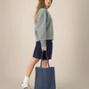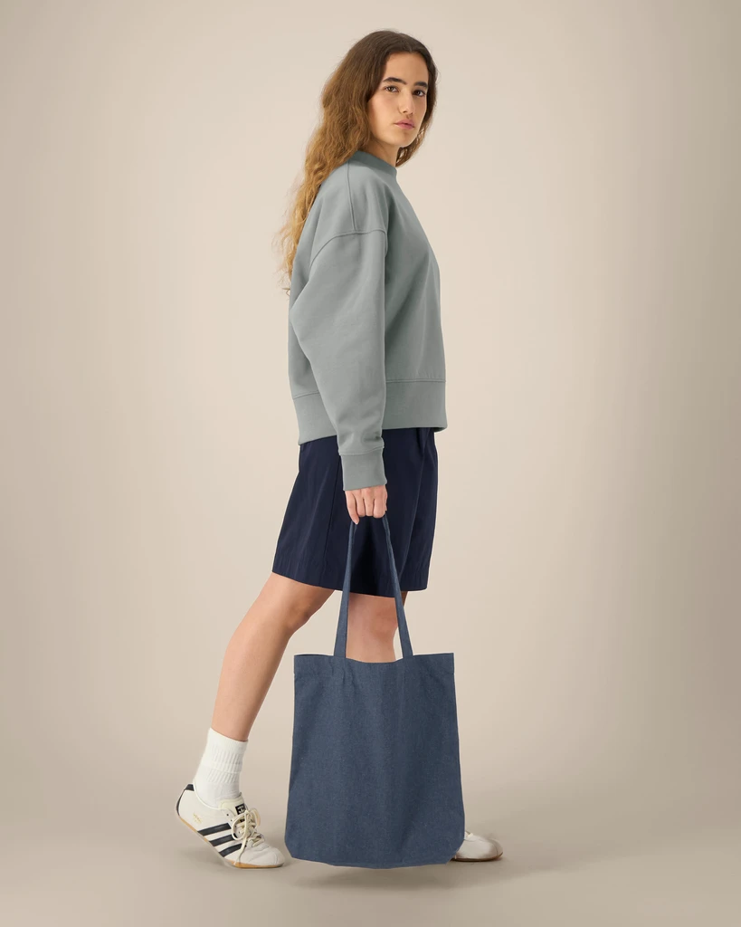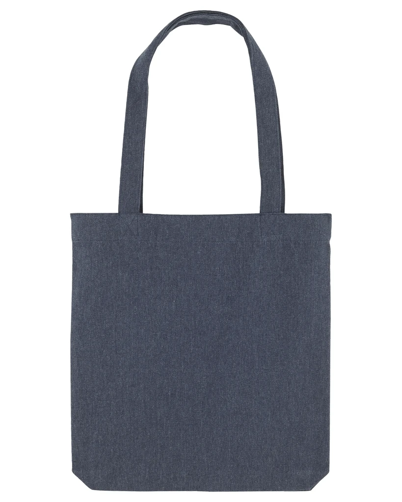 Weight: 300 gsm; Material: CANVAS - 80% RECYCLED COTTON, 20% RECYCLED POLYESTER; Top edge double folded for strength and clean finish, Long handles with reinforced cross stitch, Shaping seam at bottom to create volume