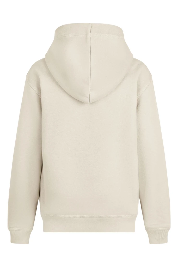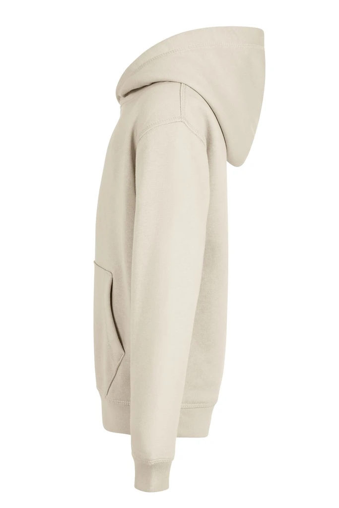 KIDS´ Hooded Sweatshirt. Brushed Fleece. 85% Organic RingSpun Cotton - 15% Recycled Polyester. 300 g/m². Brushed fleece, soft, comfortable and warm 2 panel double fabric hood Kangaroo pocket with fine binding finish and reinforced seams Non-deformable cuffs and waistband in ribbed knit fabric 1x1 Reinforced herringbone inner neck tape No brand label in neckline Unisex sizes: REEF Women´s sizes: REEF WOMAN