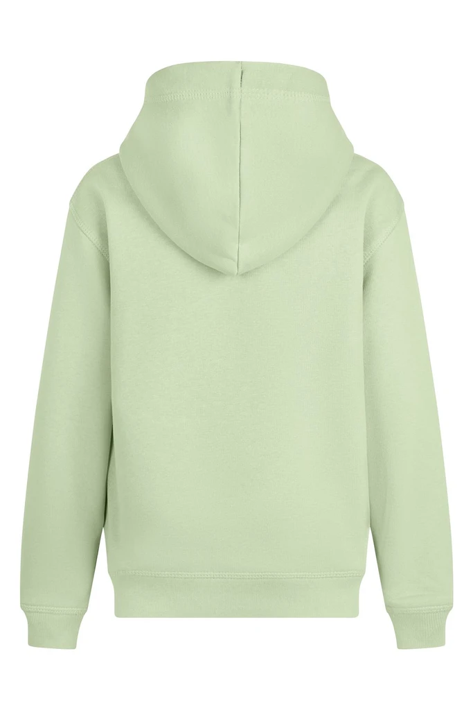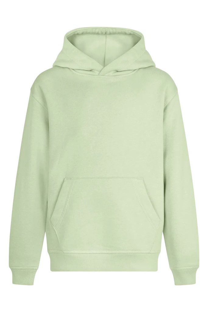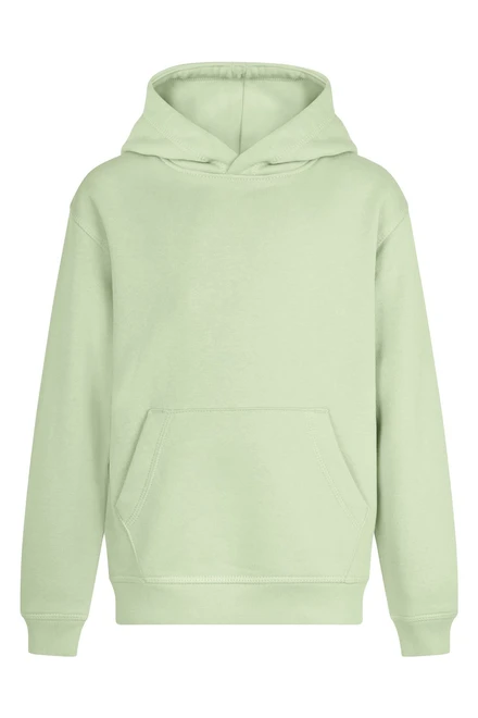 KIDS´ Hooded Sweatshirt. Brushed Fleece. 85% Organic RingSpun Cotton - 15% Recycled Polyester. 300 g/m². Brushed fleece, soft, comfortable and warm 2 panel double fabric hood Kangaroo pocket with fine binding finish and reinforced seams Non-deformable cuffs and waistband in ribbed knit fabric 1x1 Reinforced herringbone inner neck tape No brand label in neckline Unisex sizes: REEF Women´s sizes: REEF WOMAN