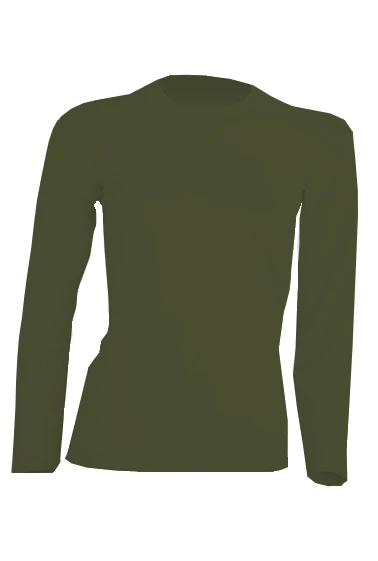 Ladies long sleeve T-shirt without cuffs. Double stitch on sleeves and bottom. 1x1 Rib neck.
