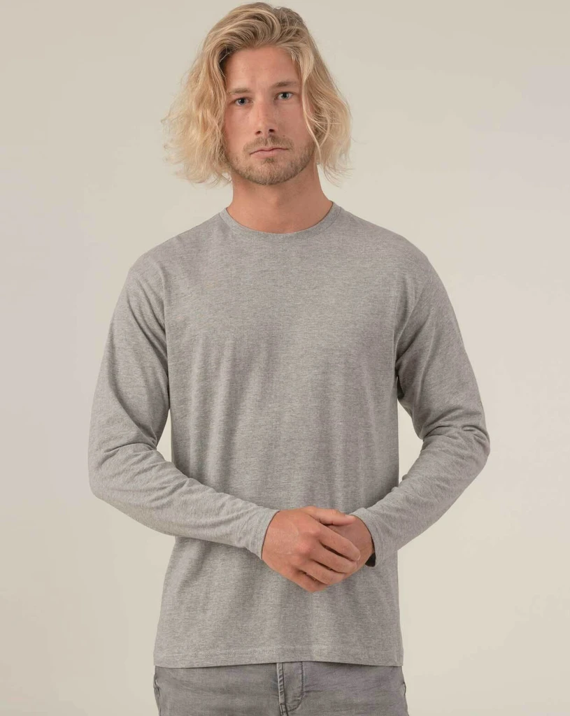 Adult long sleeve T-shirt without cuffs. Double stitch on sleeves and bottom. Shoulder to shoulder tape. Lycra rib neck. Grey Melange: 85% cotton / 15% polyester.