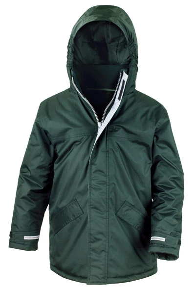 outer : 100% StormDri PU Coated Polyester Pongee • filling: Quilted 160gsm Polyester wadding • lining : 160gsm Polyester padding • concealed 3 section hood in collar with hood size adjuster • full front heavy 7mm zip fastening • 2 concealed front pockets with under storm flaps with super warm fleece linings • name and class tag inside left hand pocket • fleece lining in pockets to keep hands warm • reflective Safety tape across lower back • cuffs with tear Flap adjuster • reflective tape cuff detail • adjustable drawcord hem (EN14682 compliant)