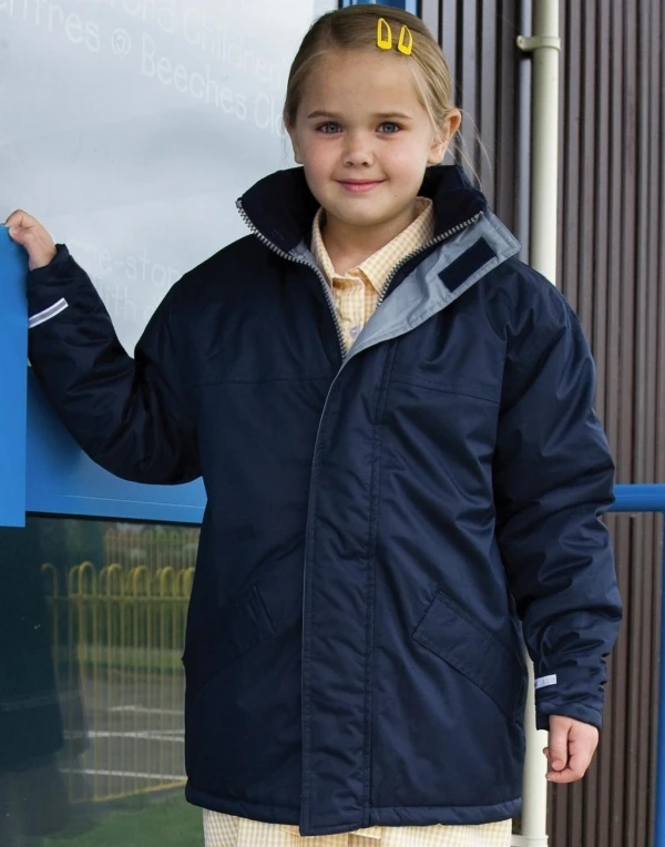 outer : 100% StormDri PU Coated Polyester Pongee • filling: Quilted 160gsm Polyester wadding • lining : 160gsm Polyester padding • concealed 3 section hood in collar with hood size adjuster • full front heavy 7mm zip fastening • 2 concealed front pockets with under storm flaps with super warm fleece linings • name and class tag inside left hand pocket • fleece lining in pockets to keep hands warm • reflective Safety tape across lower back • cuffs with tear Flap adjuster • reflective tape cuff detail • adjustable drawcord hem (EN14682 compliant)